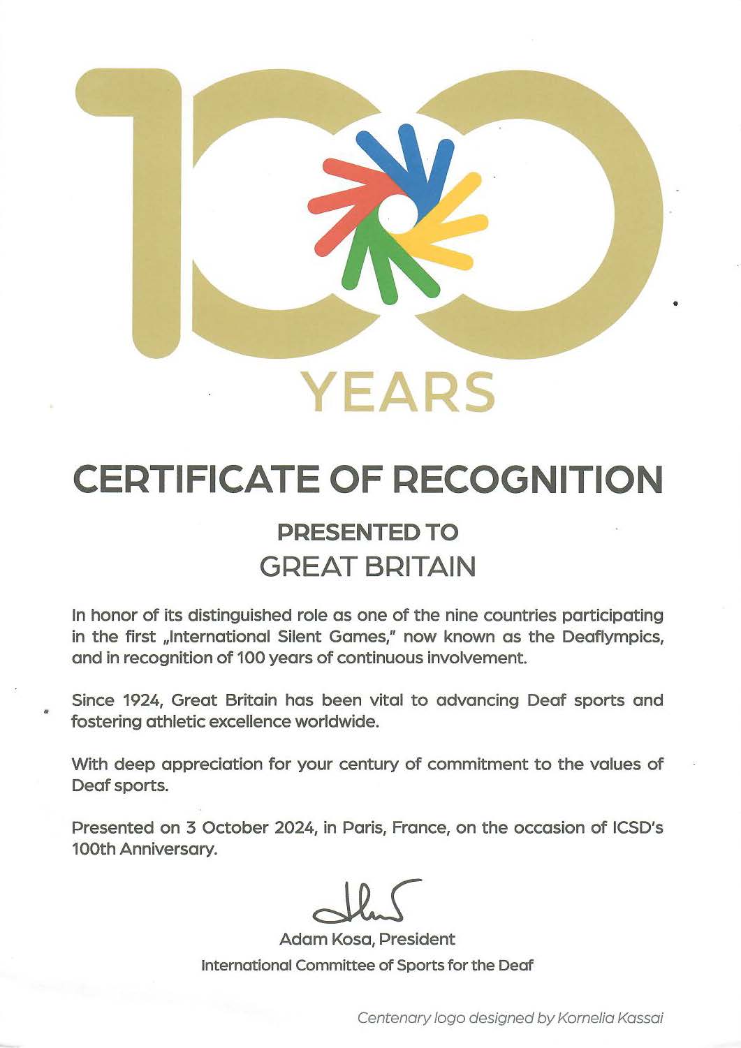 Founding certificate presented to UK Deaf Sport at the ICSD Congress September 2024.